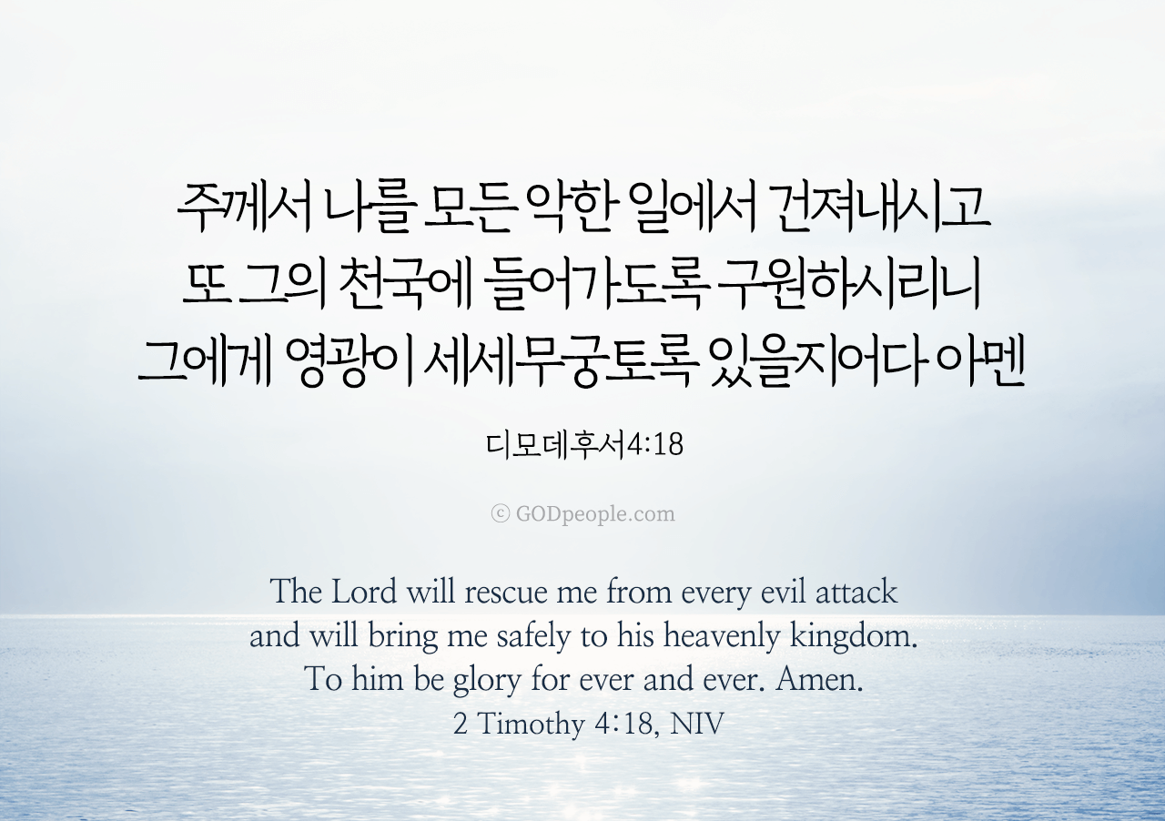 주께서 나를 모든 악한 일에서 건져내시고 또 그의 천국에 들어가도록 구원하시리니 그에게 영광이 세세무궁토록 있을지어다 아멘 _디모데후서 4:18