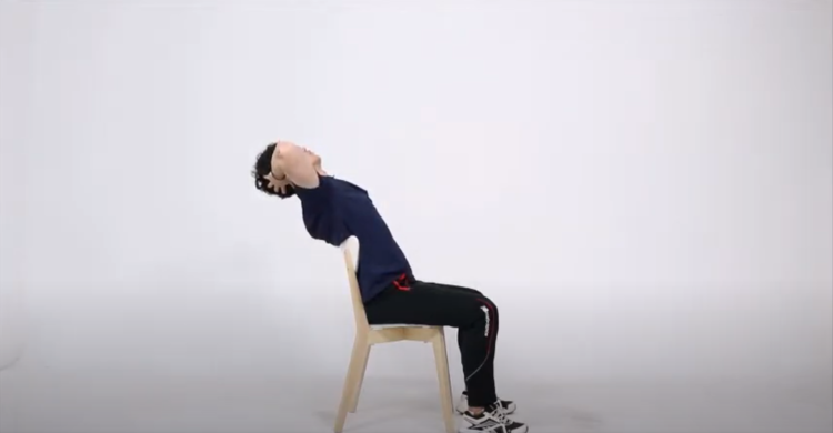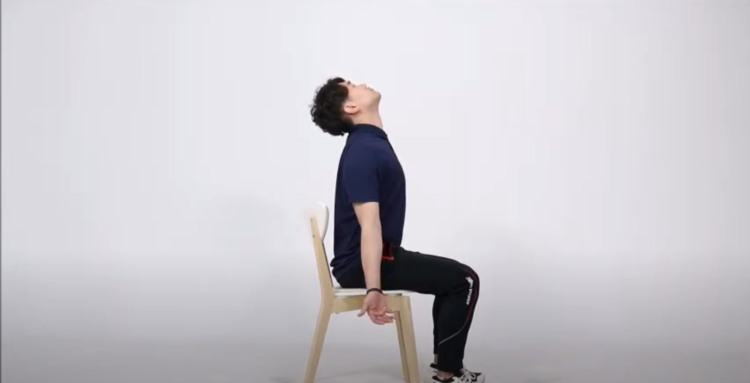뒤통수에 깍지를 끼고 상체를 뒤로 젖히며 8초간 유지, 팔을 펴고 2회 반복!!