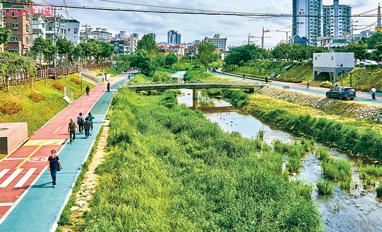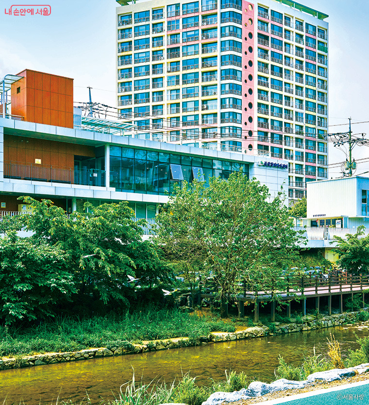 은평구 주민들의 소중한 쉼터이자 놀이마당. 은평구를 남북으로 가로지르는 이 도심 하천은 북한산 비봉에서 발원해 은평구를 지나 서대문구와 마포구로 흐른 후 홍제천과 합쳐지는 물길이다. 예전에는 흔한 동네 개천이었지만, 지금은 산책로와 자전거길이 잘 조성되어 사계절 내내 이곳을 찾는 주민들의 활기로 넘친다. 여름이면 산책로 옆 화단에 백일홍과 해바라기가 피고, 가을에는 코스모스 길이 조성되어 계절마다 꽃구경하는 재미가 쏠쏠하다.
