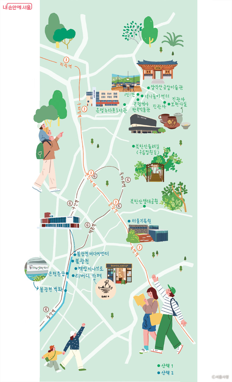 광동과 응암동을 잇는 길목에는 자연과는 또 다른 은평구의 얼굴이 있다. 오래된 시장과 도서관, 책방과 골목길, 그리고 불광천을 따라 이어지는 작고 단단한 풍경. 사람들의 하루가 고스란히 담긴 이 길을 걷다 보면 은평구의 ‘일상’을 만나게 된다.