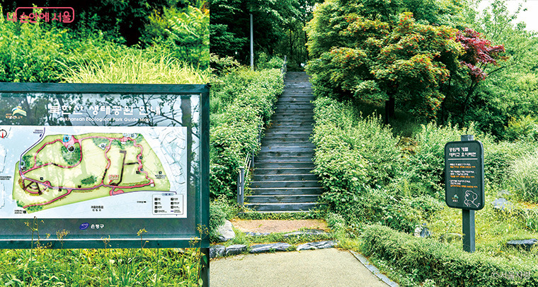 은평한옥마을 근처에서 시작되는 ‘북한산생태공원’은 말 그대로 북한산의 생태를 가까이에서 느낄 수 있는 공간이다. 울창한 숲과 맑은 계곡물이 어우러진 작은 공원으로, 등산을 시작하기 전에 몸을 풀며 둘러보기 좋다. 입구 쪽에 마련된 산림욕장 길을 따라 걸으면 도시에서는 듣기 힘든 새소리, 바람에 나뭇잎 스치는 소리를 만날 수 있다. 곳곳에 설치된 안내판에는 이 일대에 서식하는 식물과 새, 곤충에 대한 설명이 있어 아이들과 함께 자연 공부를 하기도 좋다.