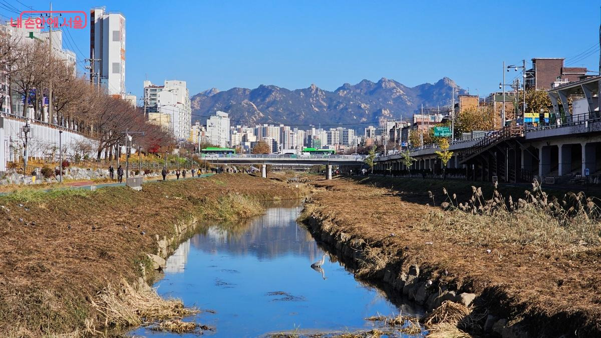 이내 불광천 수변공원길로 이어진다. 서울의 북서부를 가로지르는 하천이 불광천이다. 과거 오염이 심한 하천이었으나 지금은 물고기 철새들이 모여드는 생태하천으로 거듭났다. 산책, 자전거 타기, 근력 운동 등 다양한 활동을 즐길 수 있는 시민들의 쾌적한 휴식 공간이다. 특히 봄에는 벚꽃, 가을에는 단풍이 매력적이고, 고개를 들면 북한산 조망이 백미이다.