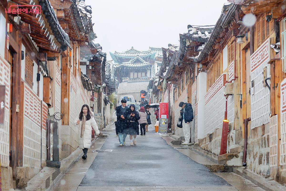 한옥의 아름다움 속에서 현대와 전통이 조화를 이루는 북촌한옥마을 관광객 방문이 제한되는 ‘레드존’ 구역이 실시되고 있어 오전 10시가 되어야 방문할 수 있었다. 이른 아침, 한옥 지붕 위로 사뿐히 내려앉은 눈은 한 채 한 채를 마치 동화 속 풍경처럼 만들었다. 좁은 골목길마다 사진을 남기려는 관광객들의 발걸음이 이어졌지만, 모두 질서를 지키며 조용히 이 순간을 만끽했다.