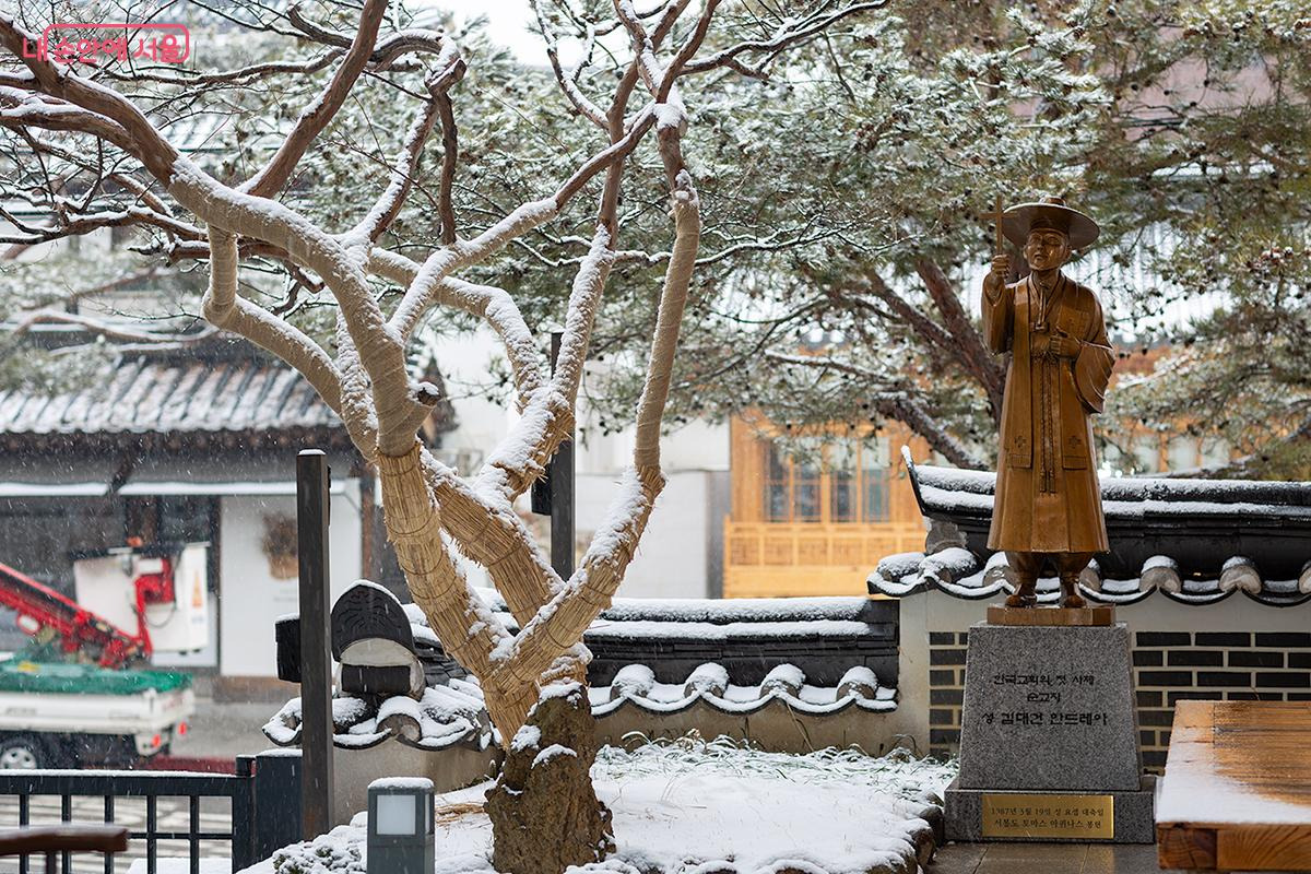 북촌한옥마을 주변에 위치한 천주교 가회동성당 김대건 신부 조형물