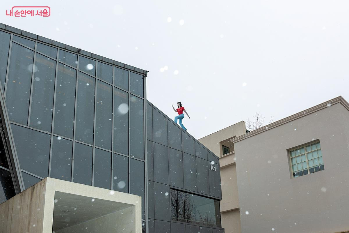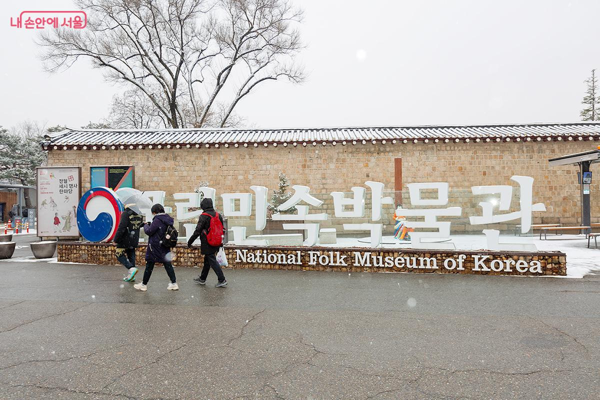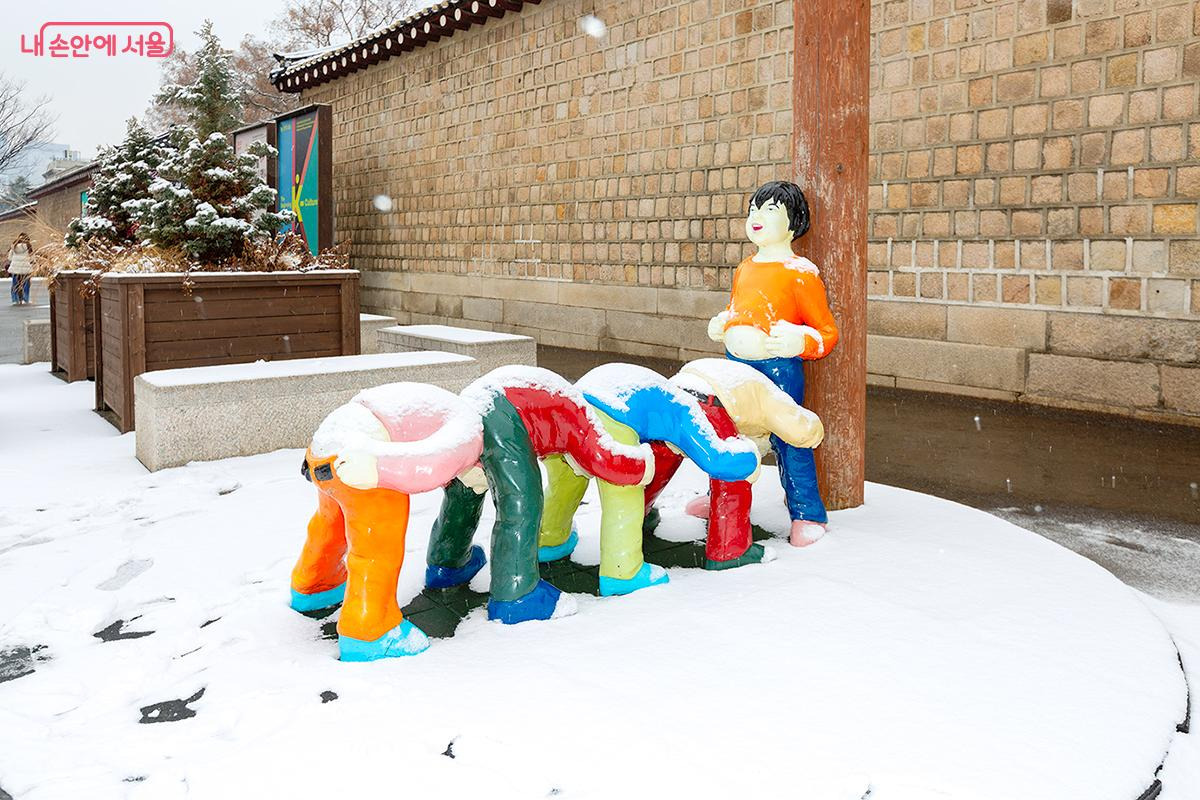 국립민속박물관 입구에는 ‘말뚝박기’ 놀이를 하는 아이들의 조형물이 자리하고 있었다. 알록달록한 의상 위로 하얀 눈이 내려앉으니 마치 동심을 품은 겨울 동화 속 한 장면 같았다.