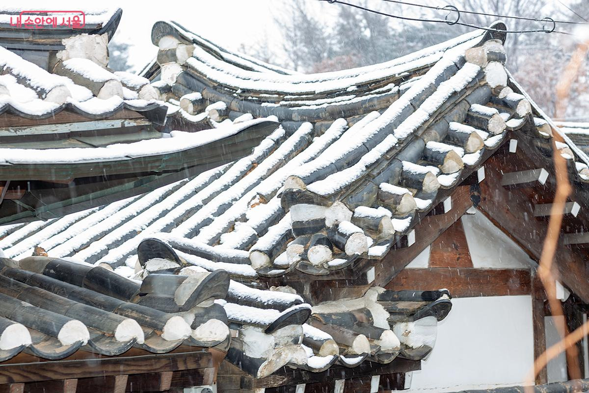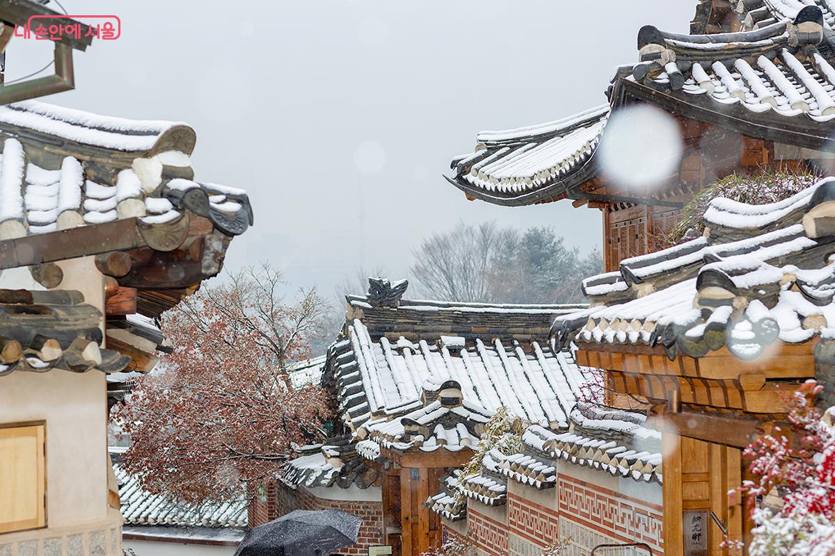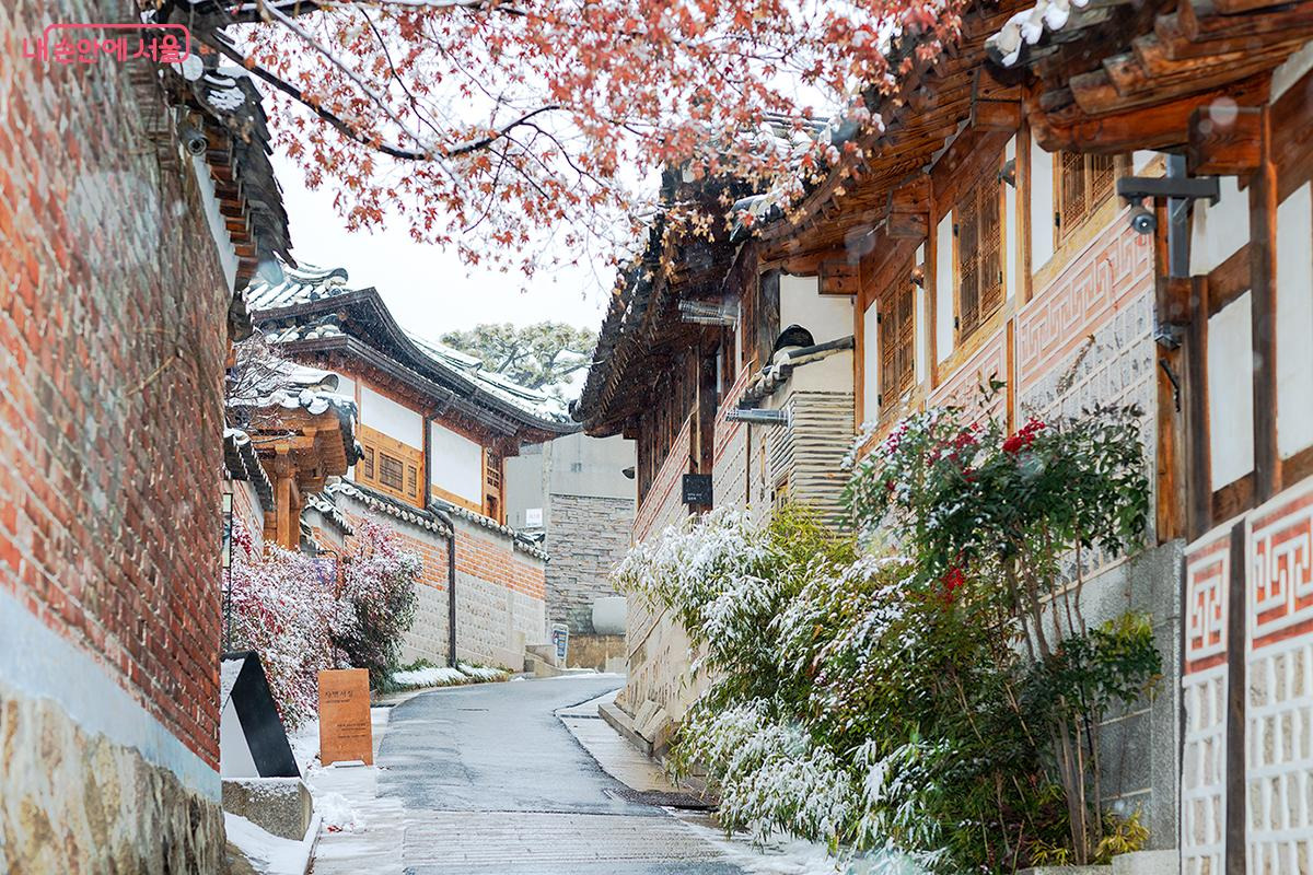 아직 붉게 물든 단풍 위에 쌓인 눈은 계절이 만들어낸 오묘한 조화를 자랑했고, 검은 기와 위로 소리 없이 내려앉은 눈송이는 한옥의 고풍스러움을 한층 돋보이게 했다. 그 모습은 마치 세월의 먼지를 털어내고 새롭게 단장한 전통의 미(美)를 보여주는 듯했다.