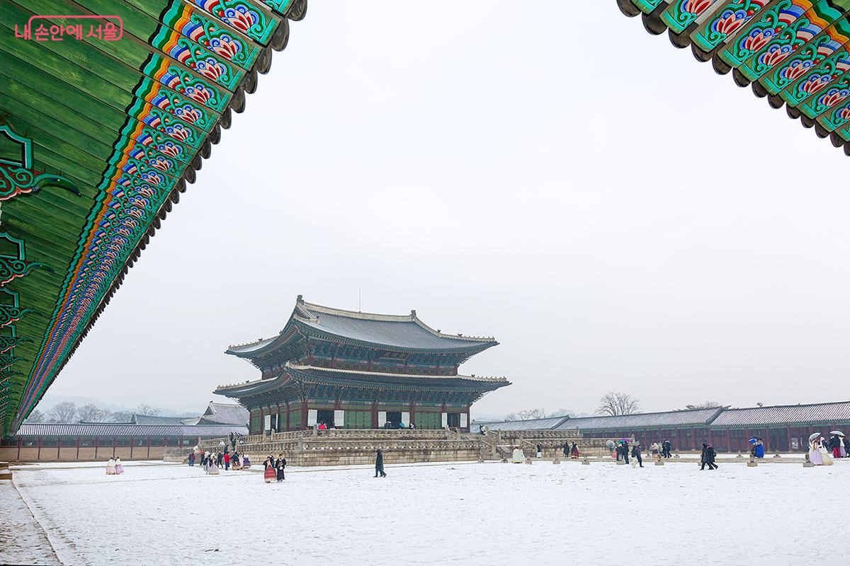 향원정은 하얀 눈이 소복이 내려앉아 더욱 신비로운 자태를 뽐냈고, 경회루에서는 고요한 연못과 웅장한 건축미가 어우러져 장엄한 아름다움을 자랑했다. 근정전에 들어서자 위엄 있는 궁궐의 분위기가 절로 느껴졌다.
