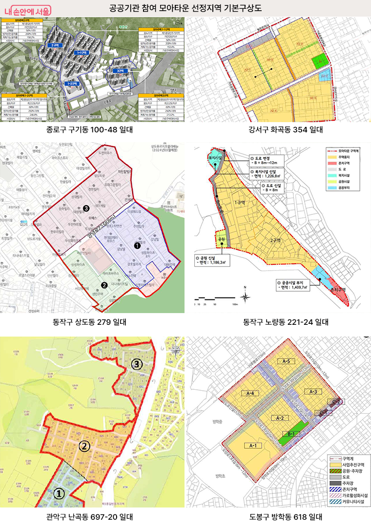 서울시는 6일 ‘공공기관 참여 모아타운 공공관리사업 선정위원회’를 개최해 ▲종로구 구기동 ▲서대문구 홍제동 ▲강서구 화곡동, 등촌동 ▲동작구 상도동, 노량진동 ▲관악구 난곡동 ▲성동구 응봉동 ▲도봉구 방학동 등 총 10개 모아타운(모아주택 21개소)을 공공기관 참여 모아타운 대상지로 최종 선정했다.