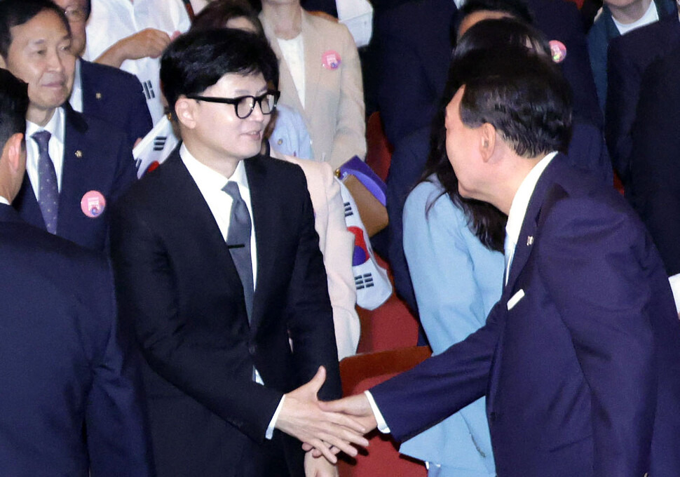 윤석열 대통령이 15일 서울 종로구 세종문화회관에서 열린 제79주년 광복절 경축식에서 퇴장하며 국민의힘 한동훈 대표와 악수하고 있다. 대통령실통신사진기자단