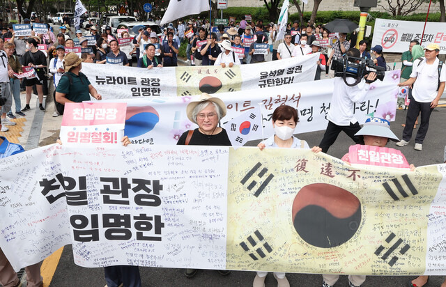 같은 시각, 서울 용산구 백범김구기념관에선 광복회 등 37개 단체가 모인 독립운동단체연합, 25개 독립운동가 선양 단체가 꾸린 항일독립선열선양단체연합이 별도의 광복절 기념식을 열었다. 김 관장을 ‘뉴라이트’라 지목한 이들은, 윤 대통령이 그의 임명을 철회하지 않는 데 항의해 별도 행사 개최를 예고해왔다. 이종찬 광복회장은 기념사에서 “최근 진실에 대한 왜곡과 친일 사관에 물든 저열한 역사 인식이 판치며 우리 사회를 혼란에 빠트리고 있다”며 김 관장 임명을 거듭 비판했다