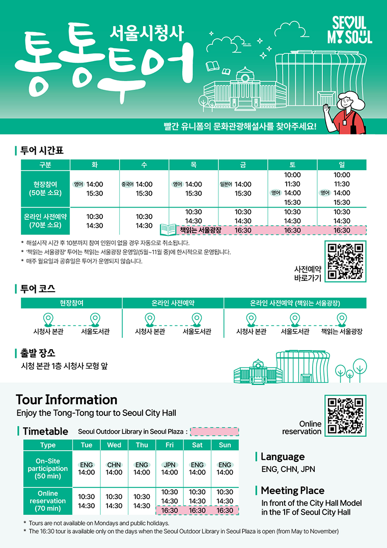 그간 영어와 한국어 해설만 진행했던 현장참여 투어를 중국어와 일본어 해설도 추가 운영한다. 책읽는 서울광장 체험 코스도 올해부터는 영어·중국어·일본어로 확대돼 총 4개 언어로 운영될 예정이다.