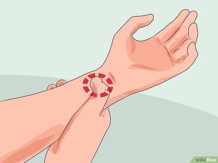 - 다른 손의 손가락 3개를 옆 방향을 보도록 팔목 위에 놓아준 후, 엄지와 검지가 비슷한 부분에 놓이도록 위치를 잡아보자. 바로 이 팔목 부분에 두 개의 큰 힘줄이 위치하고 있다.