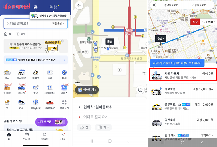 자율주행택시 호출방법 (카카오 T 홈 → 택시 출발지‧도착지 설정 → 서울 자율차 호출)