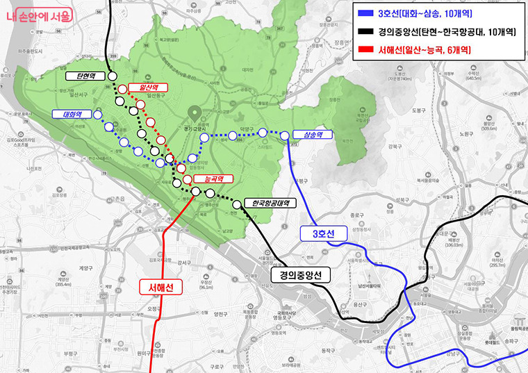 | 경의중앙선 | 한국항공대, 강매, 행신, 능곡, 대곡, 곡산, 백마, 풍산, 일산, 탄현 | |