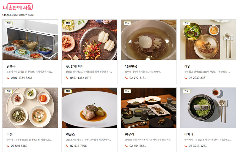 서울에서 즐길 수 있는 특별한 먹거리를 모은 ‘서울 미식 100선’ 누리집 화면