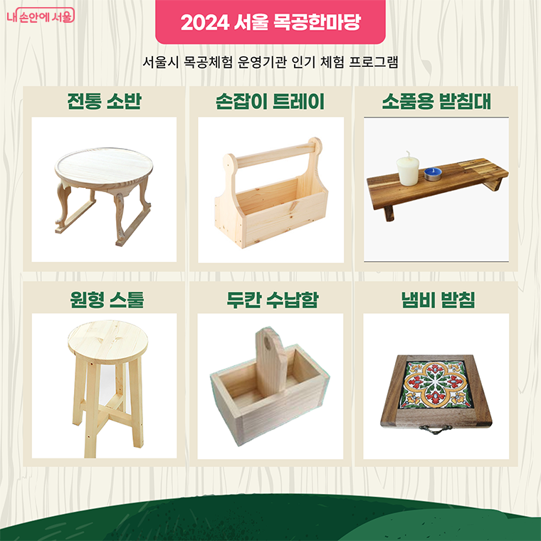 다양한 목공체험 프로그램을 진행한다. 특히 서울의 캐릭터인 해치와 소울프랜드가 새겨진 나무그립톡, 나무열쇠고리, 나무도어벨, 전통나무노리개 만들기 등은 비교적 간단해 목공을 처음 접하는 아이들과 외국인도 쉽게 참여해 볼 수 있다.