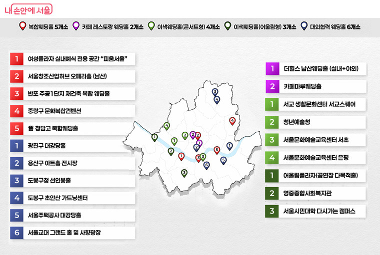 한편, ‘더 아름다운 결혼식’ 장소 및 관련 정보는 ‘더 아름다운 결혼식’ 누리집 및 스마트 서울맵에서 확인하고 신청할 수 있으며, 상담전화(1899-2154)로도 예약 및 상담을 받을 수 있다.
