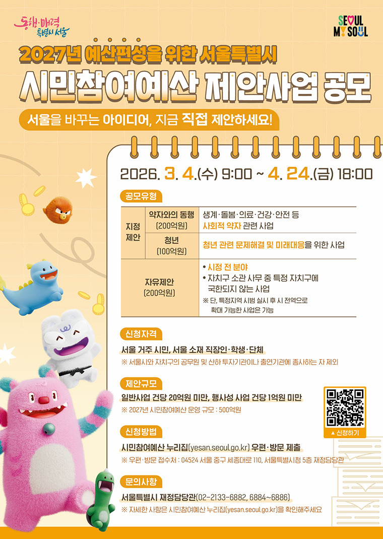 서울시가 2027년도 예산편성에 시민 의견을 반영하기 위해 4월 24일까지 시민참여예산 제안사업 공모를 실시한다.