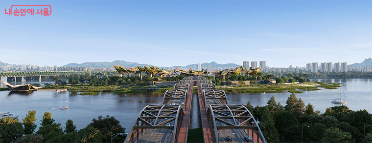 ‘하늘예술정원’은 7개의 비정형의 ‘떠 있는 꽃잎’으로 구성된 공중정원으로 독창성과 아름다움을 자랑한다. 꽃잎들은 보행로로 연결돼 시민 누구나 한강 위에서 펼쳐지는 환상적인 노을과 도시 경관을 동시에 누릴 수 있다.
