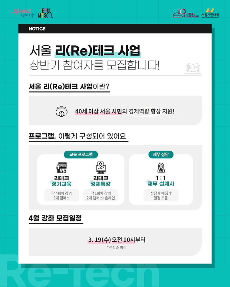 서울시는 중장년과 시니어를 대상으로 재무설계 및 경제교육을 지원하는 ‘서울 리(Re)테크’를 4월 1일부터 운영, 3월 19일 오전 10시부터 신청을 받는다. ☞ 서울시 평생학습포털 신청 바로가기