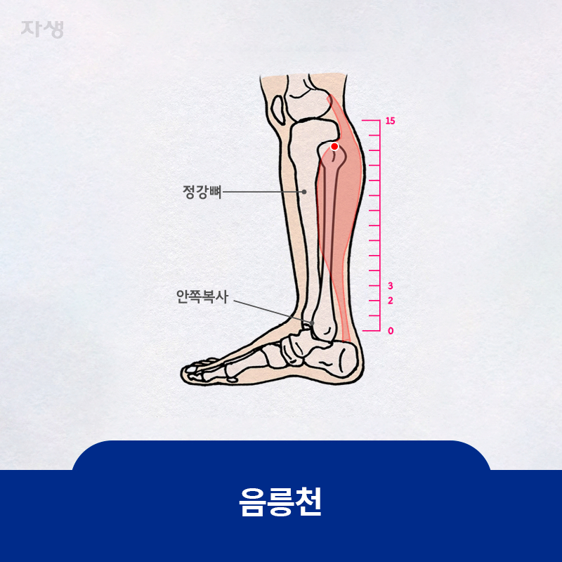 몸속 찬 기운을 몰아내고 혈액순환을 돕는 혈자리로, 꾸준히 지압하면 다리 부종 해소에 도움이 됩니다.