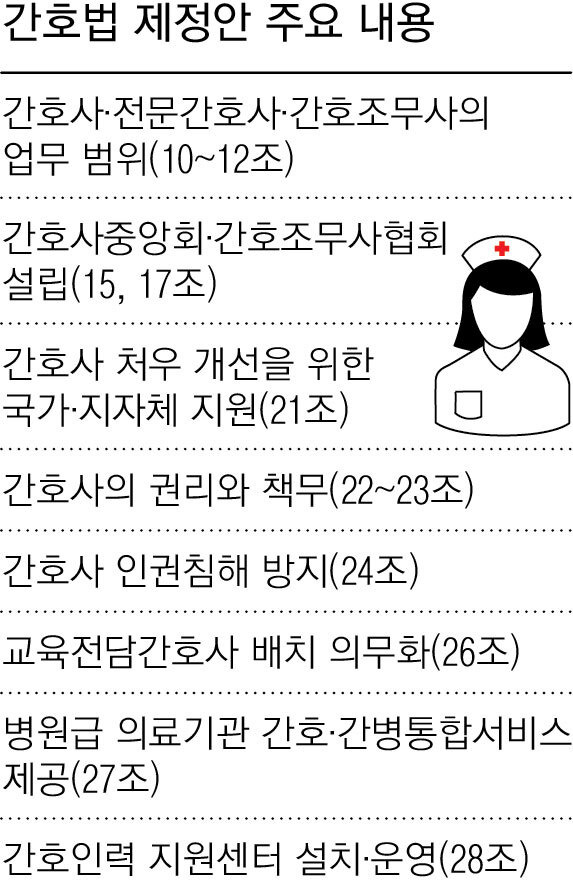 본회의에 부의된 간호법 제정안은 간호사의 업무 범위와 권리·책무를 규정하고 처우 개선을 위한 국가와 지자체의 지원을 명시하고 있지만 모두 추상적이다. 제정안이 통과되더라도 현장에서 당장 변화가 일어나기 쉽지 않다.
