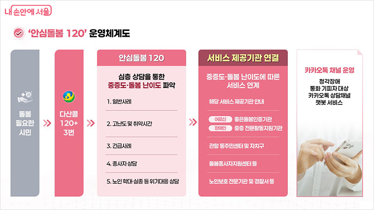 앞으로는 돌봄이 필요한 어르신·장애인 등 당사자는 물론 가족, 지인 누구든지 다산콜센터(02-120)로 전화 후 음성안내에 따라 3번(안심돌봄)을 누르면 돌봄전문콜센터 ‘안심돌봄120’의 밀착 상담을 받을 수 있다.