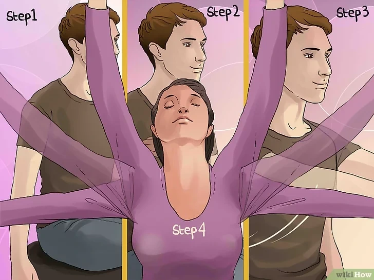 이 운동은 아무때나 아무데서나 할수있다. 목과 등의 긴장된 근육을 풀어준다
