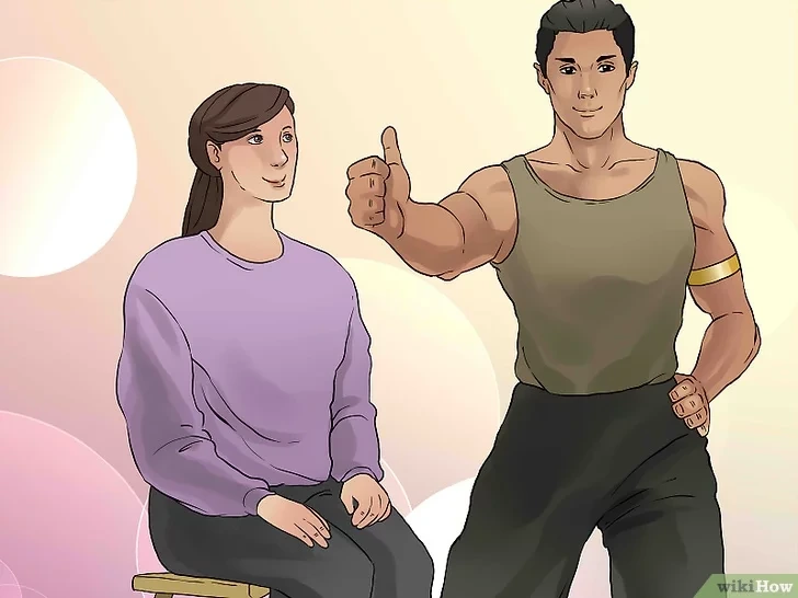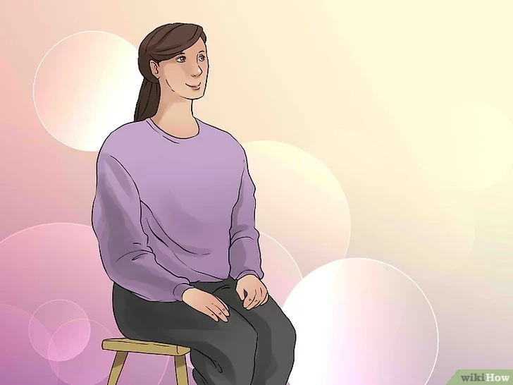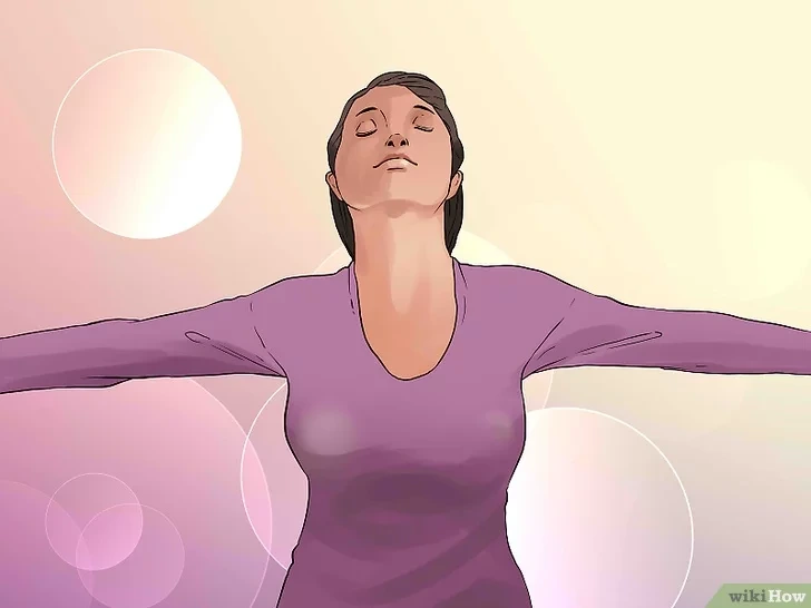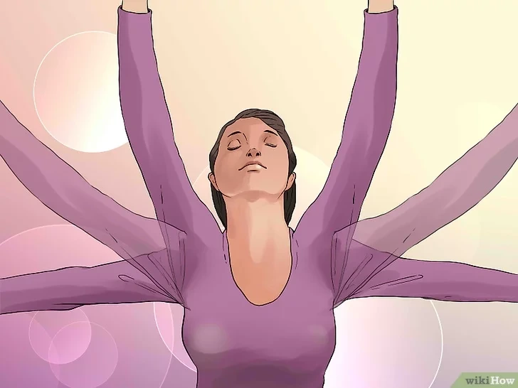 팔꿈치는 양옆으로 고정시키고 팔을 위로 가져온후 손가락을 가슴에 갖다댄다. 허리는 계속 곧게 펴주자
