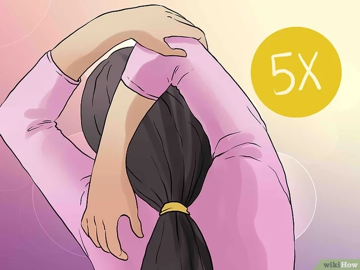 손은 머리뒤로 놓고 허리를 구부려 턱은 천장 쪽을 향하게하자. 이 자세를 10 초간 유지하고 쉰다. 5 회 반복하자