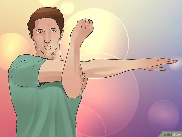 오른팔을 위 그림처럼 왼쪽으로 펴준후 왼팔을 건다