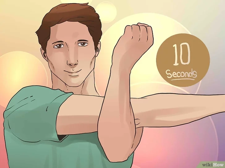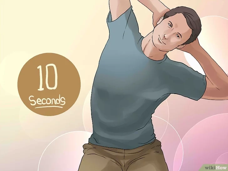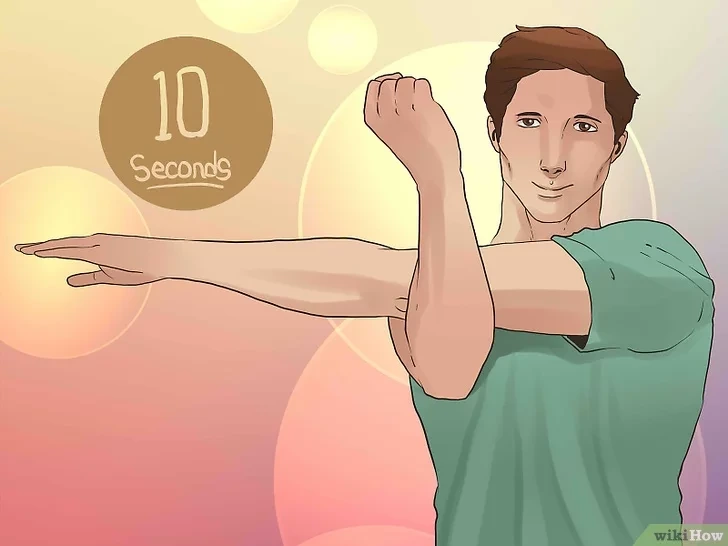 왼팔을 펴준후 오른팔을 건다. 이 자세를 10 초간 유지해주자