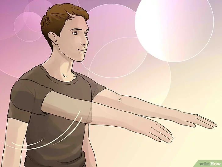 숨을 내 뱉으며 양 팔을 몸 앞쪽으로 가져간다