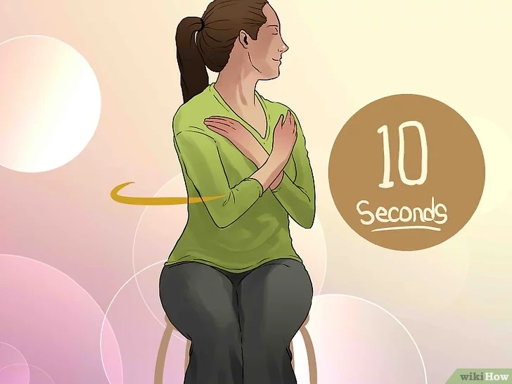 두손을 가슴에 얹고 몸통을 왼쪽으로 먼저 비튼다. 이 자세를 10 초간 유지하고 오른쪽으로 비튼다. 양쪽모두 5 회 반복한다