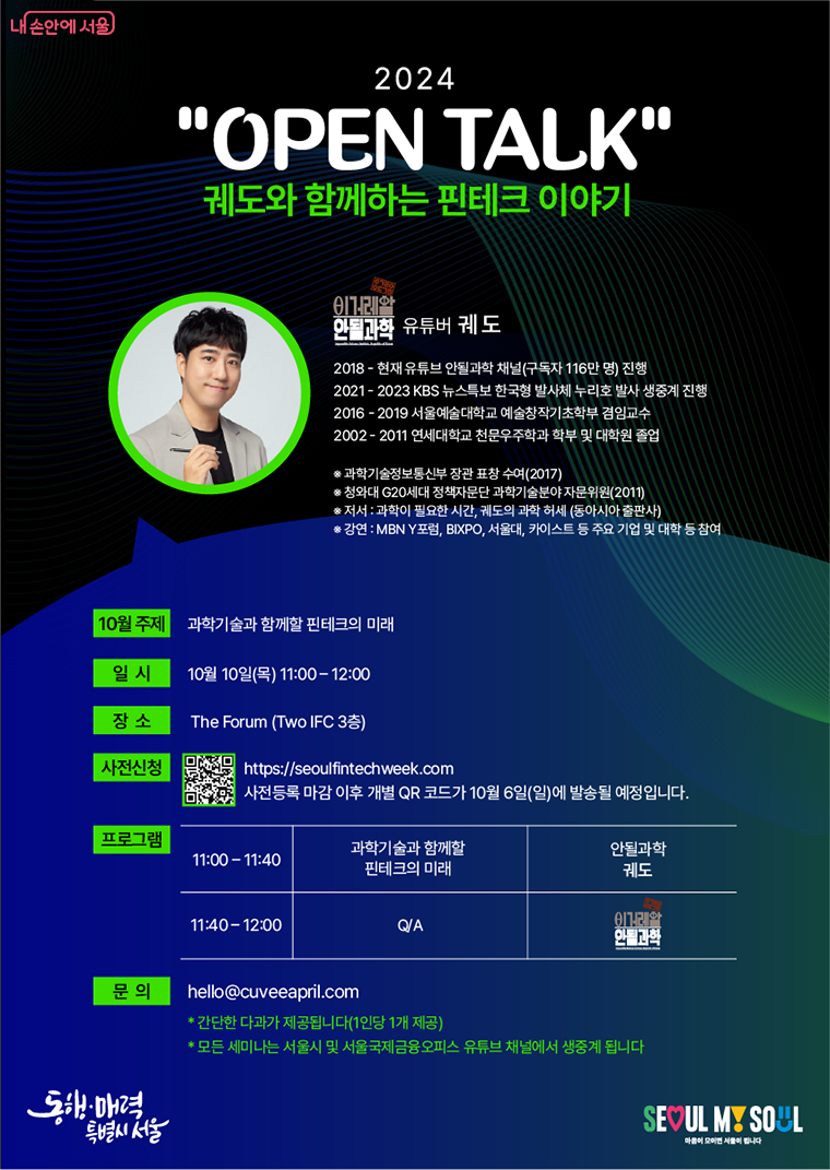 서울시는 핀테크를 주제로 과학 유튜버 ‘궤도’와 함께하는 ‘오픈토크’ 세미나를 10월 10일 개최한다