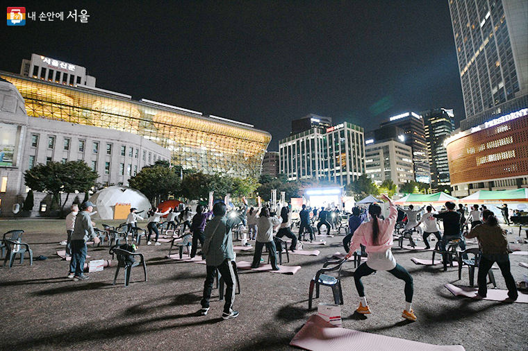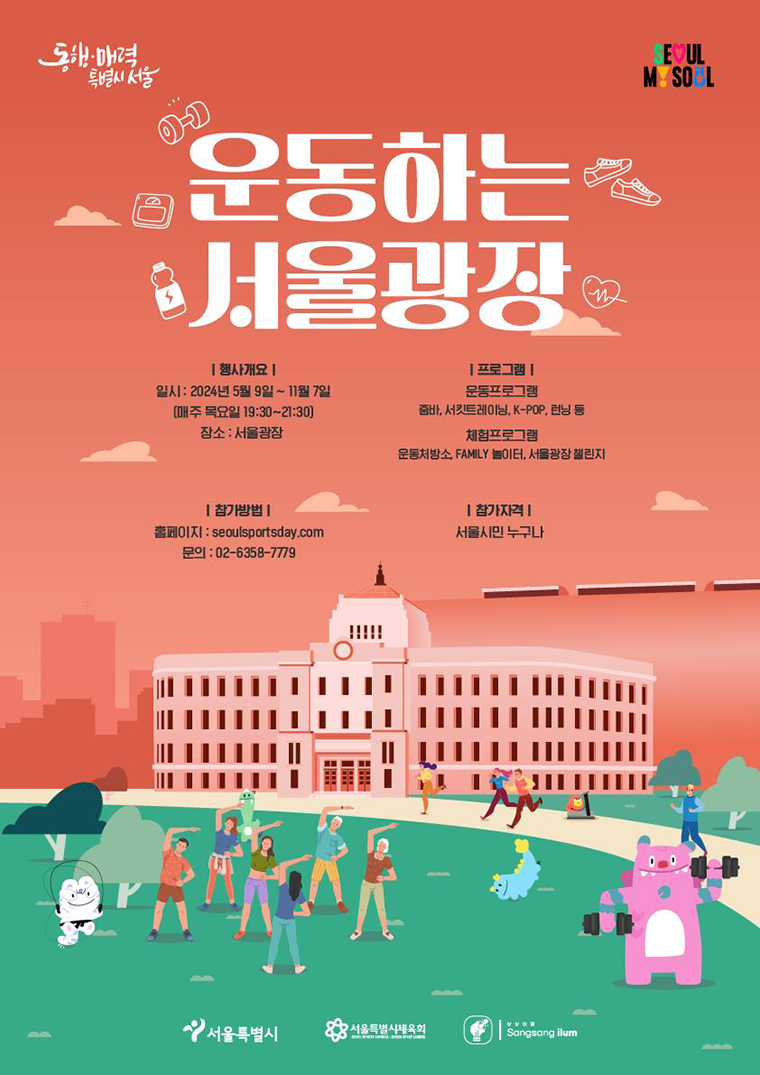 서울시는 5월 9일부터 10월까지 매주 목요일 저녁 7시, 서울광장(동편)에서 ‘운동하는 서울광장’을 운영한다. 야외 프로그램 특성상 혹서기(7월~8월)에는 운영되지 않는다.