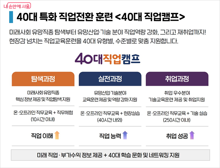 서울시가 40대의 재취업을 적극 지원하기 위해 실무 중심 교육과 현장 채용이 연계된 ‘40대 직업캠프 취업과정’을 본격적으로 운영한다.
