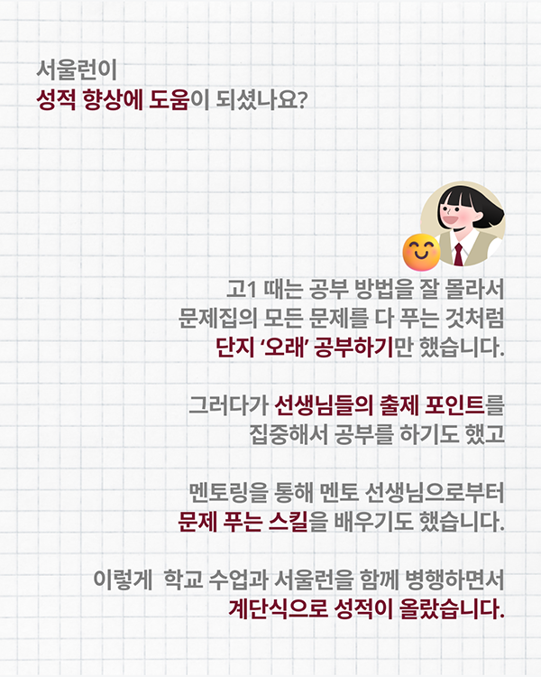 무조건 유명한 것 들으려고 하지 말고, 자신에게 적합한 인강을 선택해요. 방학에는 서울런으로 예습하고, 학기 중에는 학교 수업에 집중, 하교 후 서울런으로 복습하세요. 학교 시험에 소홀하지 않는 것도 중요합니다.