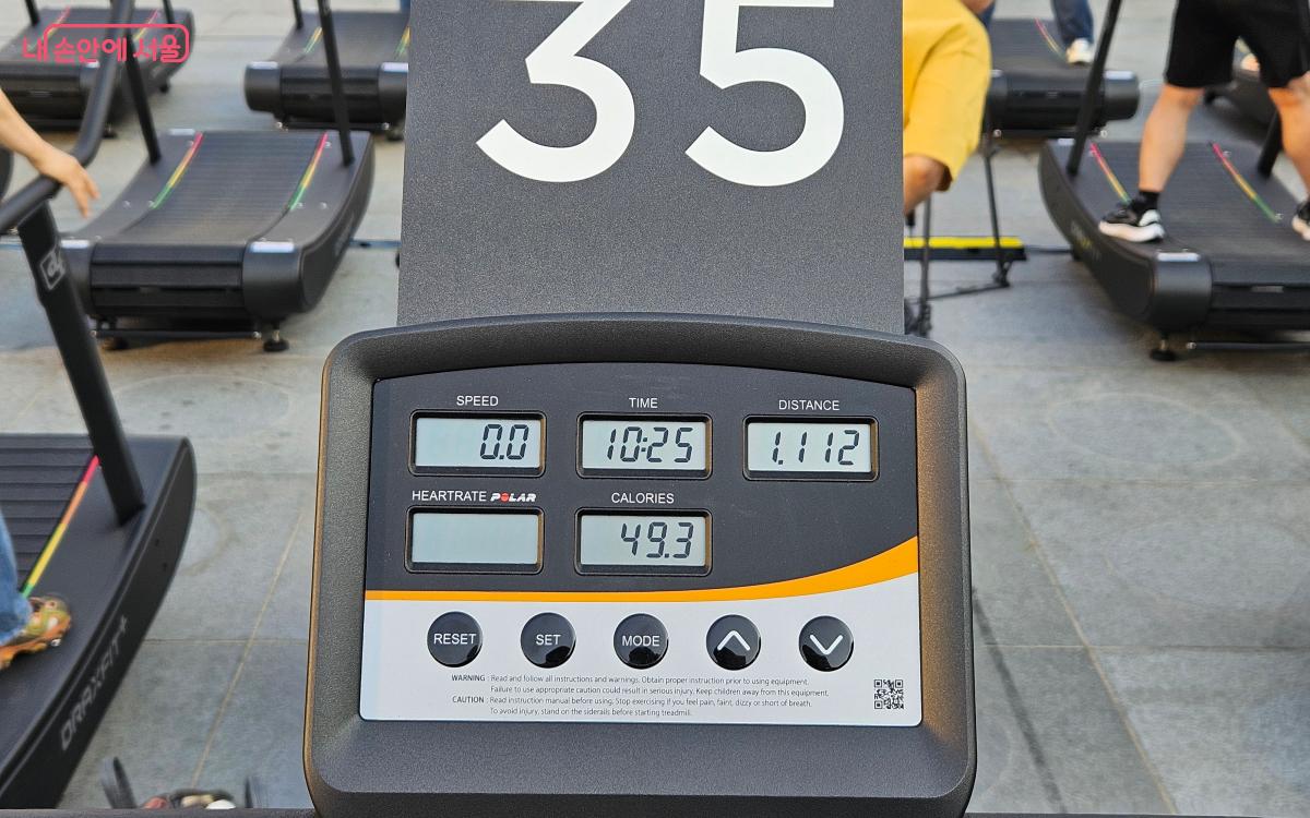 시간이 되어, 트레드밀 앞에서 준비운동을 하고, 걷기 시작했다. 무동력 트레드밀은 그냥 땅을 걷는 것과, 전기 트레드밀과는 또 다른 느낌이었다. 걸음에 따라 속도가 조절되는데, 트레드밀 앞쪽으로 가면 갈수록 더 빨라지고, 속도를 늦추고 싶다면 오히려 더 뒤로 가야 했다. 10분이라는 시간이 다른 참가자들을 지켜볼 때는 짧다고 생각했는데, 막상 무동력 트레드밀에 적응하면 긴장 속에서 타다 보니, 생각보다 긴 시간이었다.