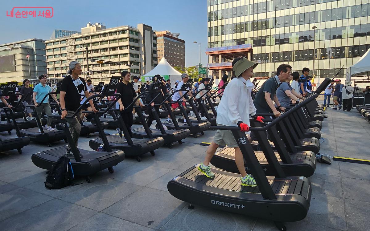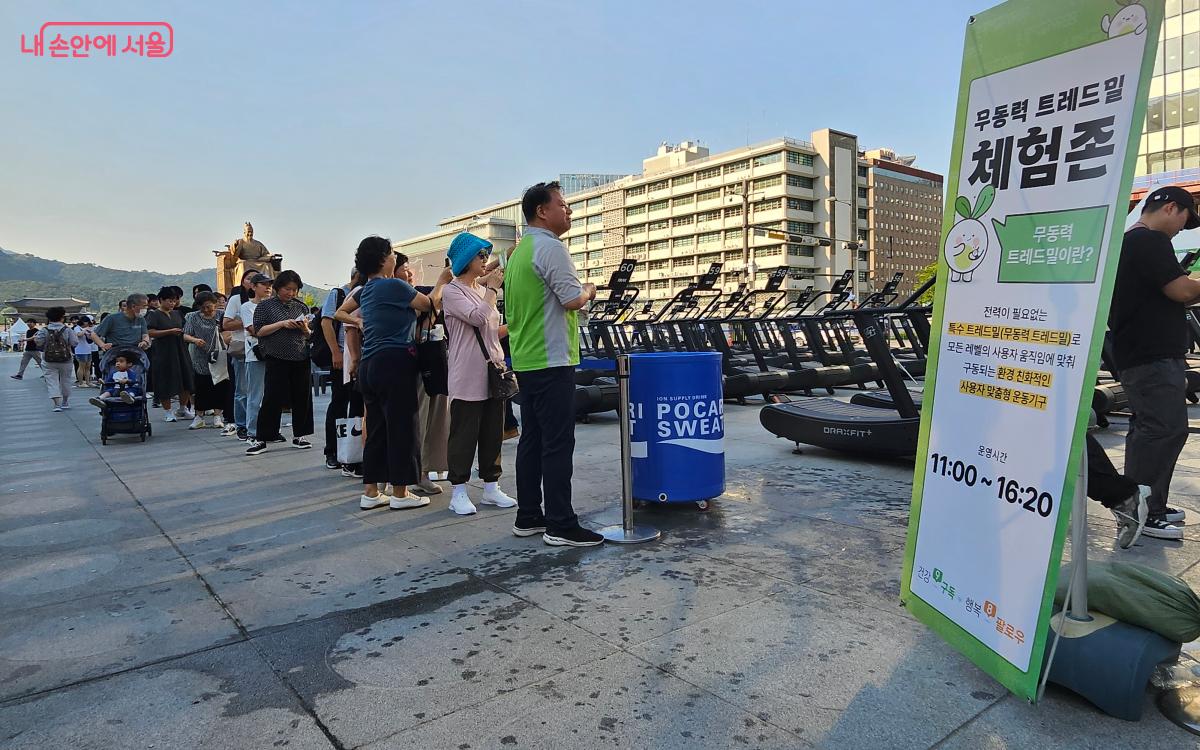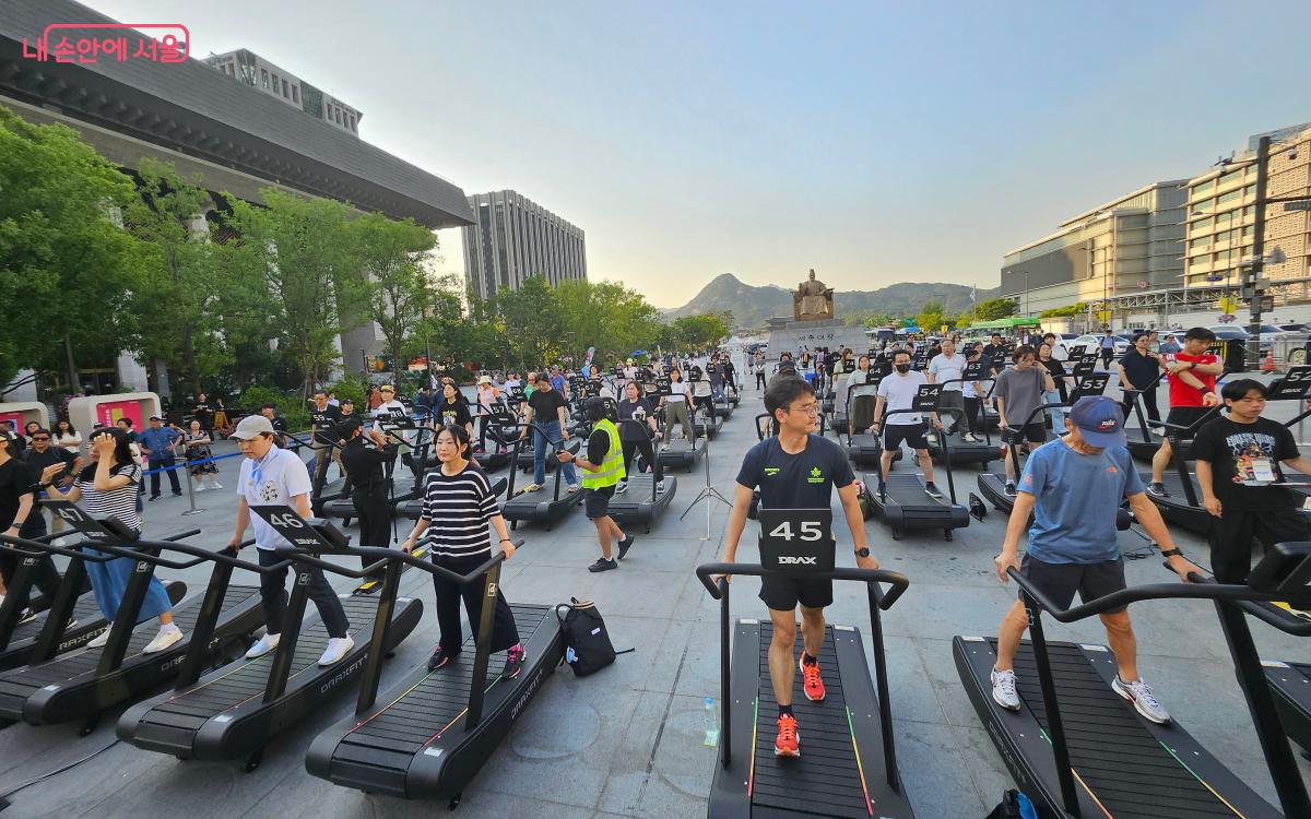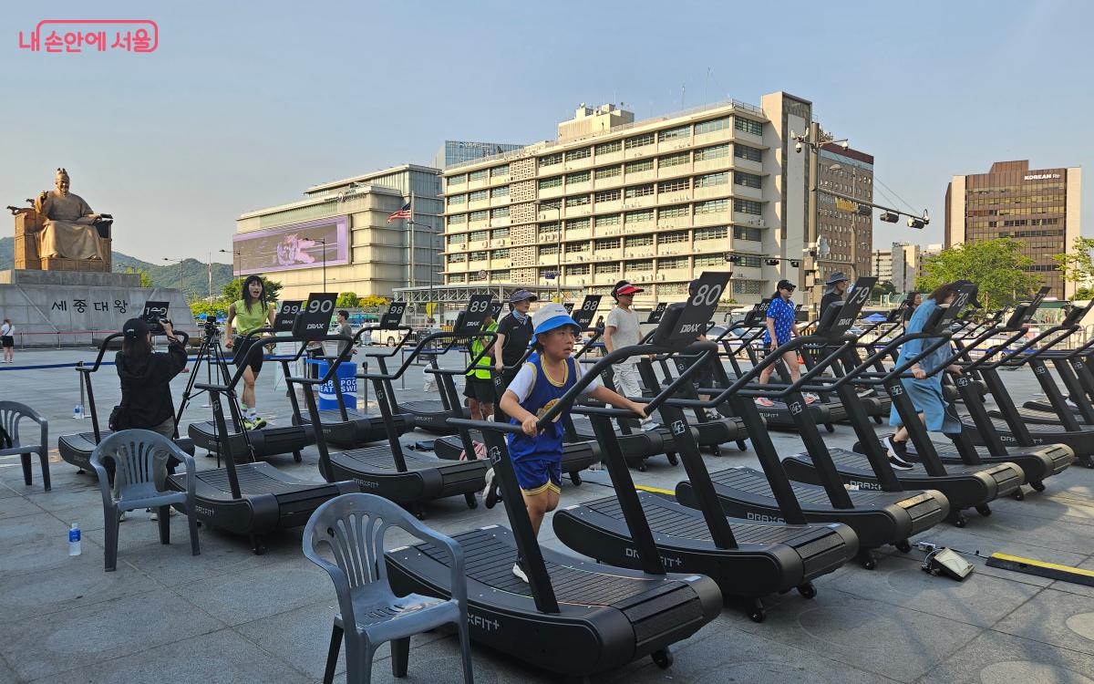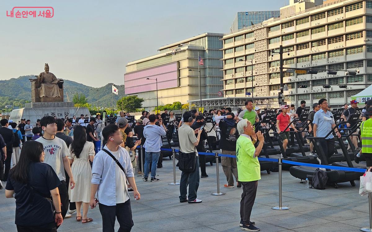 광화문광장에 도착하자, 행사장이 어딘지 바로 알아볼 수 있었다. 세종대왕상 앞에 이미 100대의 무동력 트레드밀 위에서 6회차(5시 30분) 참여자들이 열심히 걷고 있었기 때문이다.