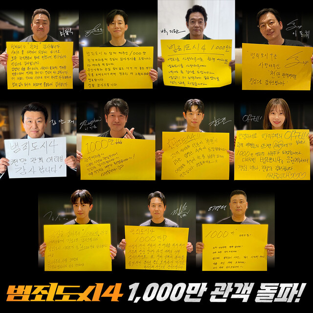 배급사 에이비오엔터테인먼트는 이날 오전 8시 이 영화의 누적 관객수가 1천만 명을 돌파했다고 밝혔다. (영화진흥위원회 영화관입장권통합전산망 기준) 이로써 ‘범죄도시’ 시리즈는 2∙3∙4편이 모두 관객 수 천만을 달성하는 ‘트리플 천만’과 함께 시리즈 전체 누적 관객수 4천만 명을 넘겼다. 지금까지 시리즈 가운데 세편 이상 천만 관객을 모은 영화는 할리우드 영화 ‘어벤저스’(‘엔드게임’, ‘인피니티 워’, ‘에이지 오브 울트론’)가 유일했다. ‘범죄도시 4’는 지난 2월 말 개봉한 ‘파묘’에 이은 올해 두 번째 천만 영화로, 역대 한국영화로는 24번째로 천만영화 목록에 오르게 됐다.