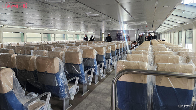 이후, 한강버스 내부에 들어서면 가장 먼저 파노라마 통창이 눈에 띄며, 큰 창 너머 한강의 시원한 풍광과 서울 도심의 야경을 만끽할 수 있도록 했다.