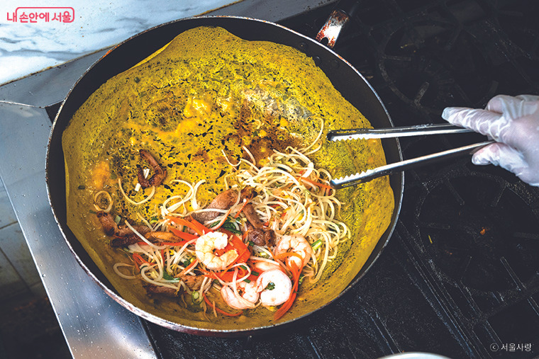 포옹싸의 바인쌔오는 반죽을 얇게 부치고 채소와 해산물을 넣어 완성한다.