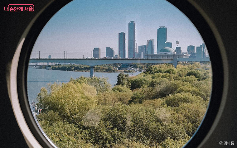 양화대교 위 ‘카페 진정성’ 둥근 창을 통해 여의도한강공원과 여의도 일대 마천루를 조망할 수 있다.