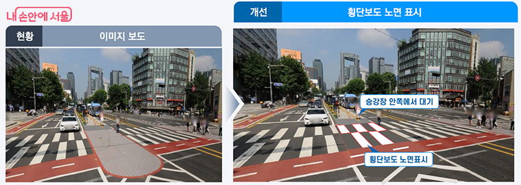 보행공간이 부족하거나 안전시설이 미비한 마들로 등 44개 도로에 대해선 내년까지 보도 신설·확장하고 안전시설 추가 설치 등 개선 사업도 함께 진행한다. 차도와 보도의 높이 차이가 없는 중앙버스정류소 대기공간은 시민들이 승강장 안쪽에서 안전하게 대기할 수 있도록 횡단보도 노면표시로 교체한다.