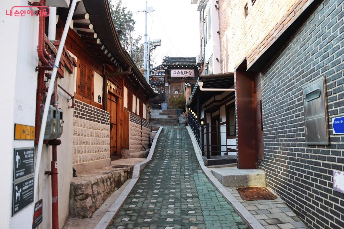 잘 보존된 한옥과 현대적인 카페, 갤러리가 조화롭게 어우러져 독특한 분위기를 자아낸다.