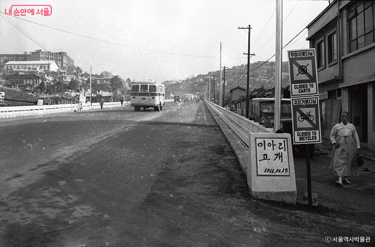 1950년 피난민들이 폭파된 한강 인도교 대신 놓인 부교를 통해 강을 건너는 모습