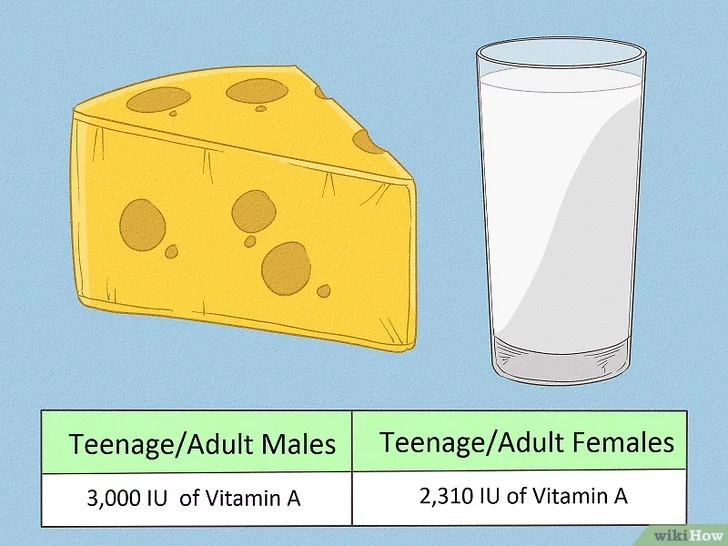 - 참고로 체다 치즈 30g에 비타민 A가 300IU, 전지유(일반 우유) 1컵에 500IU가 들어 있다.