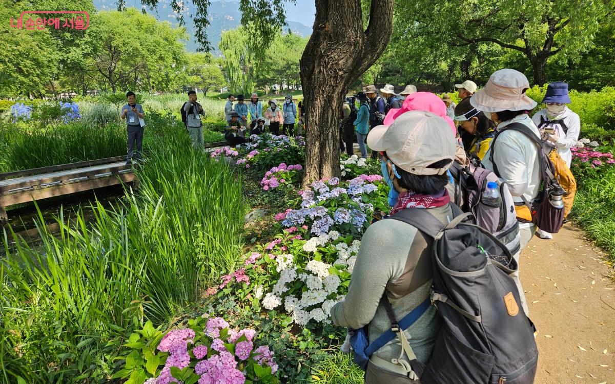 창포원에 조성된 '서울둘레길 정원'에서 수국에 대한 설명을 들었다.