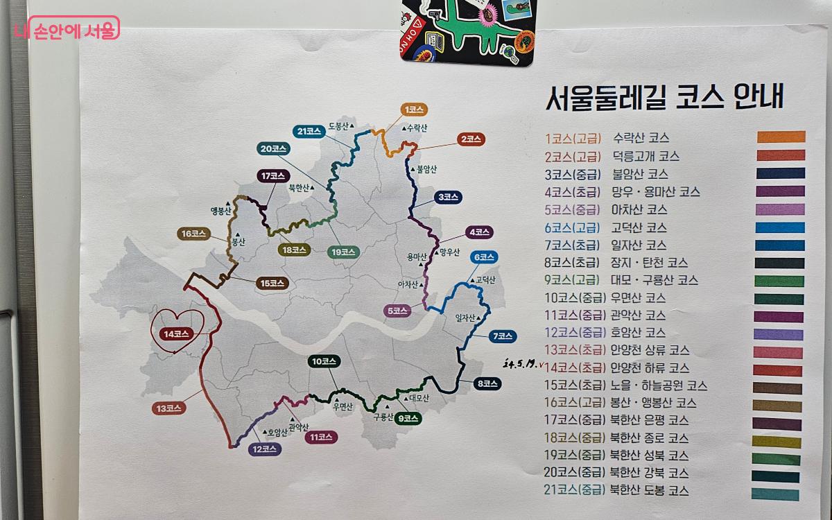 서울시청 시민청에서 미리 챙겨온 2.0 스탬프판에 14번 코스 스탬프를 찍으며 아내와의 ‘서울둘레길’ 대장정이 시작되었다. 가장 먼저 눈에 들어온 것은 코스 시작을 알리는 큼지막한 표지판과 바닥에 그려진 둘레길 표지였다. 이번에 개편하면서 이용객들이 쉽게 둘레길임을 확인할 수 있도록 통일된 디자인으로 표시를 한 것이다. 코스당 약 90개의 황색 안내판을 설치하고, 나무에도 같은 색의 띠를, 또 갈림길마다 코스별 번호와 긴급 상황 시 연락을 할 수 있는 QR코드를 표시하여 안전하게 둘레길을 즐길 수 있도록 조성했다.